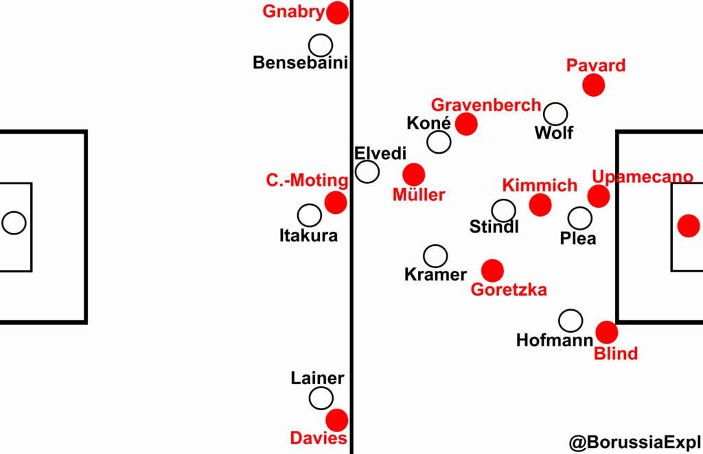 Beim Gegentor zeigte sich, dass die Fohlen dafür bestraft wurden. Davies entschied das direkte Duell gegen Lainer für sich und konnte durchbrechen, während er Chupo-Moting im Rückraum finden konnte. Kramer und Koné waren weiterhin in 1vs1 Duelle verwickelt, und einem der beiden fehlte damit der eine Schritt, um den Pass im Rückraum zu verteidigen. Eine andere Staffelung hätte bspw. erlaubt, dass einer der beiden Sechser als Anker vor der Kette im Raum absichern und hätten dadurch eine tiefere Position (somit kürzere Wege zur eigenen Box). Zur Wahrheit gehört allerdings auch, dass die Fohlen trotzdem in Überzahl waren, als Chupo-Moting im Rückraum zum Abschluss kam. Elvedi verteidigte den offensiven Passweg von Davies zum zweiten Pfosten (den Gnabry ballfern attackierte), bei Itakura und Bensebaini fehlte die Kommunikation (Letzterer hätte Gnabry übernehmen können, sodass Itakura den Rückraum verteidigt), und Koné fehlte der letzte Schritt zum Angreifer.
