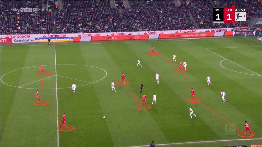 Mit der roten Karte, dem frühen Treffer und mit weiteren Konterchancen, waren die Fohlen emotionalisiert. Das Angriffspressing wurde im Verlauf der ersten Halbzeit nicht weiter angepasst: Die 1vs1 Situationen blieben weiterhin, mit dem Unterschied, dass Plea nicht mehr Upamecano presste, sondern Yann Sommer. Positiv ausgelegt: Gladbach zwang Bayern dadurch pro-aktiv zu frühen langen Bällen; Negativ ausgelegt: Die Fohlen pressten naiv, weiter ohne Absicherung – trotz Überzahl.