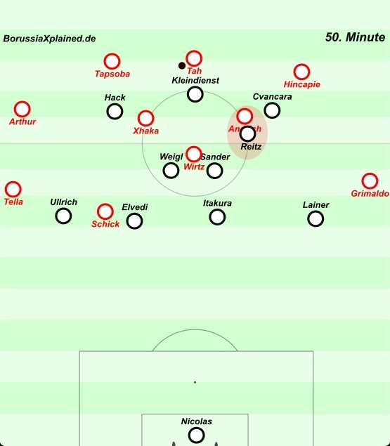 Seoane reagierte auf die Umstellung der Leverkusener und spiegelte, wie zu Beginn der Partie (4-4-2 vs. 4-4-2), erneut den Gegner (3-2-5 vs. 5-2-3). Reitz fiel in die Abwehrkette, während Außenverteidiger Lainer zum Halbverteidiger innen umstieg.