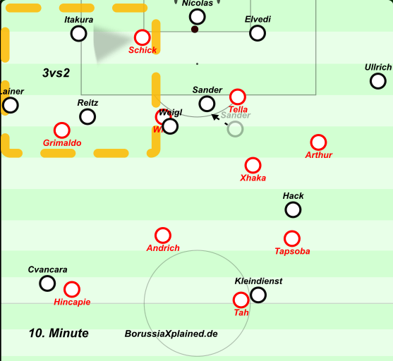 Reitz fehlte im Halbraum (am Flügel gebunden durch Grimaldo) und Weigl + Sander waren durch ihre Defensivorientierung nicht da, um bei geeigneten Pressingversuchen der vorderen Offensivspielern nachgehen zu können. Diese Momente braucht es, um die Spieldynamik – sei es zumindest für kürzere Phasen – zu verändern.