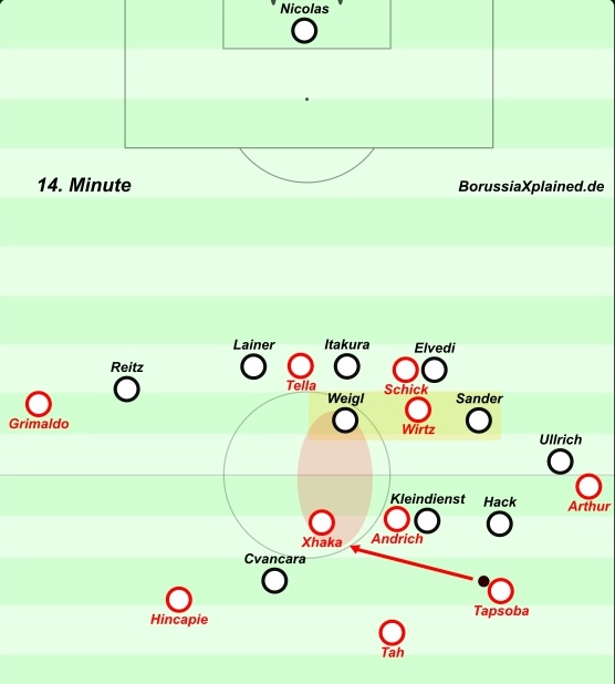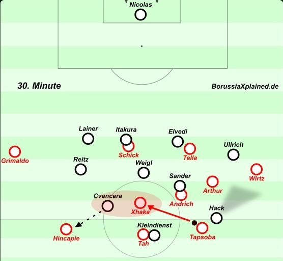 In diesen Situationen war das Zentrum löchrig, weil Cvancara und Hack zu früh auf dem Sprung auf Hincapie und Tapsoba waren, sodass Tah den vertikalen Pass an Kleindienst vorbei zu Xhaka oder Andrich spielen konnte.