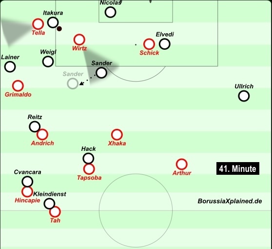 Die defensiv-orientierten Sechser schlossen zwar erfolgreich den Raum ab und nahmen zunächst Wirtz aus dem Spiel, konnten jedoch kaum Druck auf Leverkusens Sechser ausüben. Leverkusen ist spielstark genug, dass sie Gladbachs Unterzahl (5vs3) im ersten Block ausspielen können; denn in -2 Unterzahl muss das Pressingverhalten im Timing und in der Intensität auf allerhöchstem Niveau sein, um zum Beispiel den Deckungsschatten im Pressing längstmöglich aufrecht erhalten zu können.