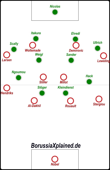 Mit Sander besetzte man mit Weigl die Doppel-Sechs. Ngoumou feierte seinen ersten Startelfeinsatz im neuen Jahr und ersetzte Cvancara. Der restliche Mannschaftsteil blieb, wie im Heimspiel gegen Bochum, sodass die Borussia im üblichen 4-2-3-1 / 4-4-2 startete.