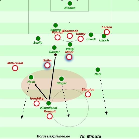Mit Millot und Stiller hatte Hoeneß eine spielstarke Doppel-Sechs, aber eben jene, die defensive Herausforderungen im Zweifel eher vernachlässigen. Die Fohlen hatten reihenweise schnelle Balleroberungen tief im eigenen Drittel, die mit hohem Laufvolumen (Ullrich, Hack, Ngoumou und Kleindienst fielen vor allem auf) in Kombination mit Stöger als Verbindungspunkt konterten.