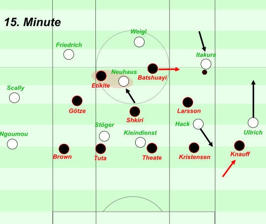 Interessant war aber auch, dass sich Achter Neuhaus infolge dieser Muster immer wieder aus dem Mittelfeld herauslöste und sich bewusst zwischen Ekitike und Batshuayi positionierte, um diese eng zu binden. Dadurch verlängerte sich einerseits deren Pressingweg auf die Innenverteidiger Itakura und Friedrich, andererseits wurde Ekitike beim Ballspiel auf der linken Seite immer wieder gebunden, wodurch Weigl aus der Isolierung befreit wurde. Dadurch war mehrmals eine zentrale Spieleröffnung über Weigl möglich.