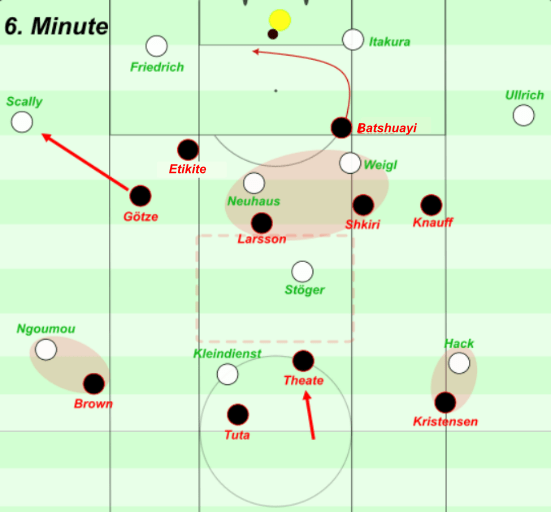 Allgemein hätte man von Beginn an durchaus eine flachere Zirkulation um den Gegnerblock herum anstreben können. Gerade die teils noch etwas unabgestimmten Bewegungen des Doppelstürmers der Eintracht hätten dies durchaus zugelassen. Zudem wäre der weite Pressingweg von Götze auf Scally eine Einladung gewesen, über Scally den Weg in die Breite zu suchen. Gerade Ngoumou hätte man über sein Tempo auf diesem Weg auch in die Tiefe bekommen können.