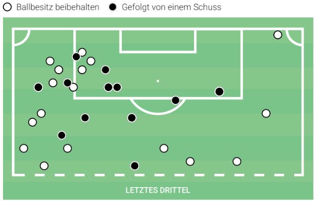 Ein Blick auf die Heatmap verdeutlicht zudem, welcher Spielertyp Castrop ist: Er bewegt sich viel zwischen den Strafräumen und fühlt sich auf der linken (Halb-) Seite wohl. Solche Beschreibungen treffen auf „Achter“ zu, die weniger das Spiel aufbauen und Rhythmus bestimmen, sondern viel mehr beschleunigen und nach vorn tragen.