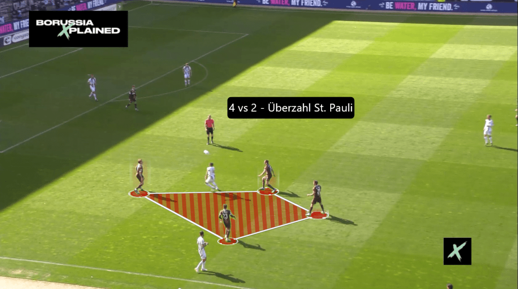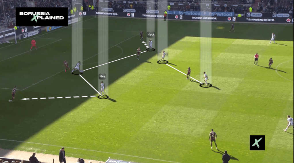 Borussia hatte gegen den Ball Probleme Druck auf Gegenspieler und vor allem Ball zu erzeugen. Das hatte zwei Gründe: St. Pauli besetzte ihre Flügel doppelt mit Flügelverteidiger Treu und Saliakas und Flügelstürmer Saad und Weißhaupt. Das zwang Gladbach auf der rechten Seite dazu, dass Honorat mit Treu – der teils hoch in die letzte Linie schob – mit fiel. Scally war bereits von Saad gebunden. Durch Honorats Fehlen im vorderen Block, konnte LIV Ritzka große Räume zum andribbeln nutzen. Andererseits ließ sich Sechser Smith dynamisch in die Kette fallen und schaffte somit einen 4er-Aufbau. Dadurch konnten beide Halbverteidiger Ritzka und Nemeth breit schieben. Durch diese Staffelung streckte man Gladbachs erste Pressinglinie horizontal mit Hack, Kleindienst und Plea. Diese hatten zu weite Wege, weil St. Pauli in Not immer auf ihre weite Überzahl im Zentrum (2vs1: Smith und Wahl vs Kleindienst) zurückgreifen konnten. Meistens konnten sie sogar durch das Zentrum hinweg über Irvine durchspielen, oder über ihr Dreicksspiel im Halbraum.