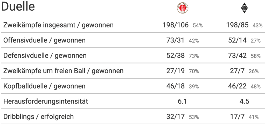 St. Pauli schaffte es nummerisch in Überzahl bei zweiten Bällen zu sein, wenn sich einerseits Gladbach aus dem tiefen Spielaufbau zu langen Bällen gezwungen fühlte, anderseits auch, wenn die Gastgeber selbst lange Bälle spielten. Die Verbindung zwischen Smith und Irvine waren oft gegeben – so auch innerhalb der Dreierkette. Sinani setzte sich bei eigenen langen Bällen in HZ1 ab, um eine geeignete Staffelung für den zweiten Ball zu gewinnen. Die Statistik rund um die Zweikämpfe der freien Bälle belegen dies eindeutig: St. Pauli gewann 70% dieser Bälle.
