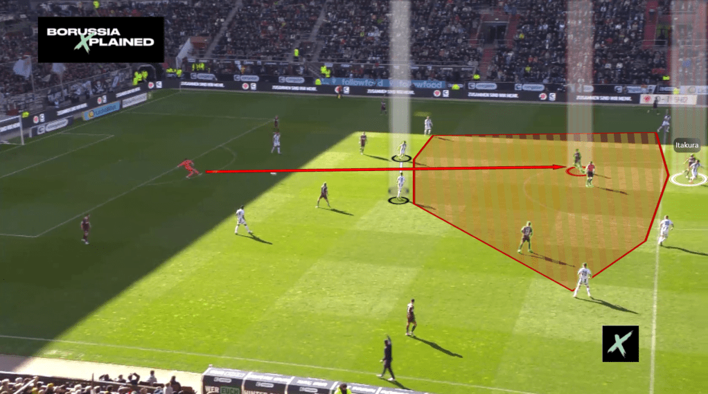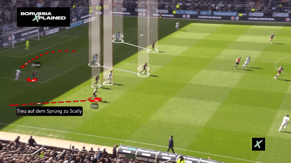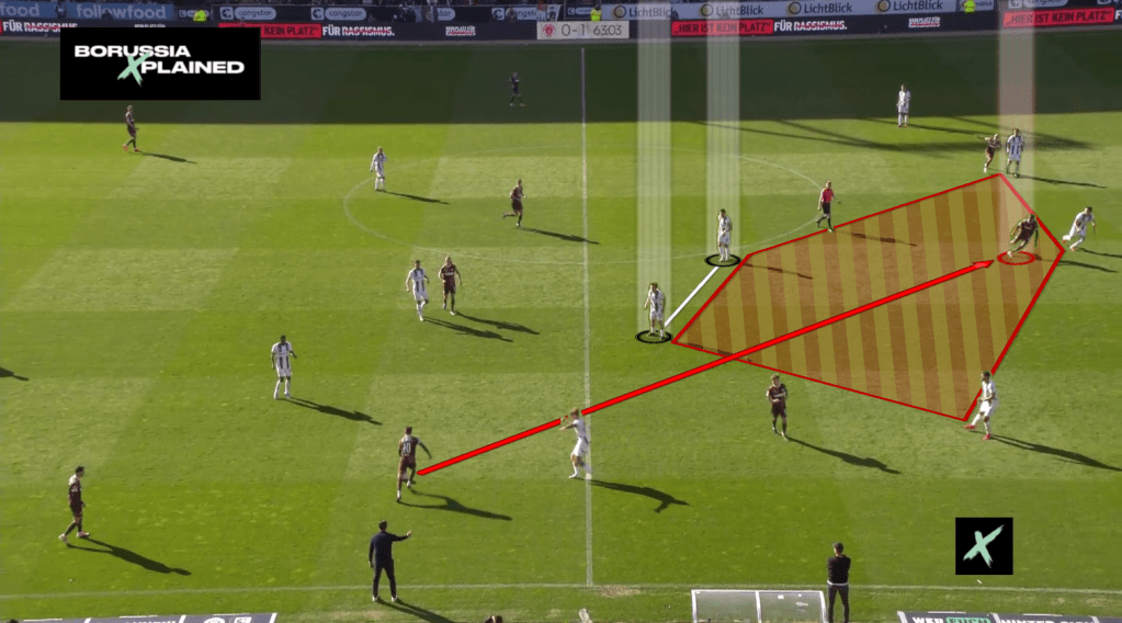 St. Pauli bindete zudem ihren Keeper Vasilj stärker ein, um gegen die 1vs1-Zuteilung Überzahl im Aufbau zu erzeugen. Der 29-jährige Torhüter überzeugte mehrmals mit progressiven Flachpässen, die ihre Mitspieler fanden. Durch die hohe Bindung beider Sechser – Reitz und Weigl – war eigentlich einer der beiden Innenverteidiger – Itakura / Elvedi – gezwungen vorzuverteidigen. Problematisch dahingehend war jedoch, dass beide Innenverteidiger im Gegensatz zur Vorwoche eine schwache Partie spielten (Elvedi mit einer Zweikampfquote von 16% in der Luft und auf dem Boden; Itakura immerhin mit 100% in der Luft, jedoch mit nur 25% auf dem Boden). Des anderen wurden sie im Zentrum durch Einrückbewegungen der Flügelstürmer, meist Saad, gebunden, sodass Sinani als Zehner große und freie Räume genießen konnte.