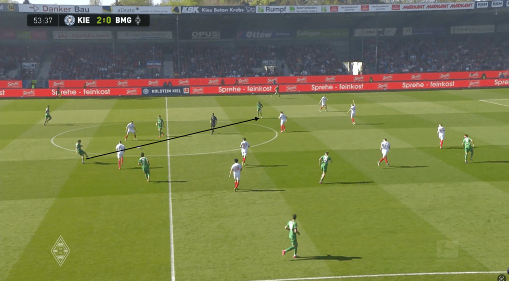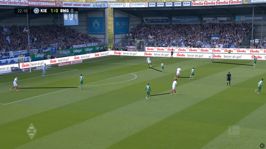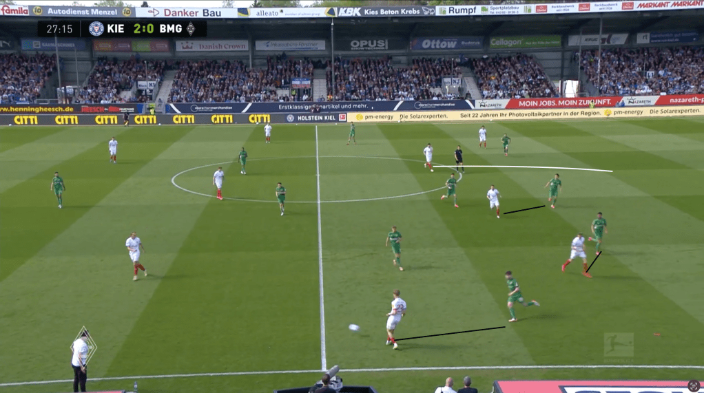 Die Fohlen mussten somit enorme Laufarbeit leisten, um die Räume wieder zu schließen und verloren sich dabei, wie schon in Dortmund zuletzt, in ihrer Positionierung ein wenig selbst. Kiel agierte mit Tiefenläufen aus dem Halbraum hinter die Gladbach Verteidigungslinie, da diese ballnah gebunden wurde und ballentfernt (im Bild unten Scally) die sich öffnenden Räume zu spät erkannten und schließen konnten. Somit gelang es den abstiegsbedrohten Gastgebern immer wieder mit vertikalen Chipbällen hinter die letzte Linie der Fohlen zu kommen, diesen Raum zu belaufen und den Fohlen weh zu tun.