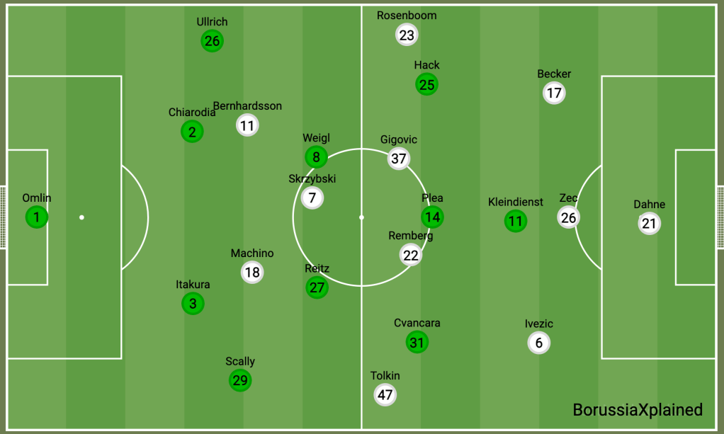 Im Vergleich zum Auswärtsspiel im Signal Iduna Park aus der Vorwoche musste Trainer Gerardo Seoane erneut einen verletzungsbedingten Ausfall verkraften. Mit Nico Elvedi fehlte einer der beiden Stamminnenverteidiger. Er wurde ersetzt vom Fabio Chiarodia, während Robin Hack zurück in die Startelf kehrte für Kevin Stöger. Die Kieler hingegen traten mit der gleichen Startelf an, die in der Vorwoche ein beachtliches und verdientes 1:1 Unentschieden bei RB Leipzig verbuchen konnte.