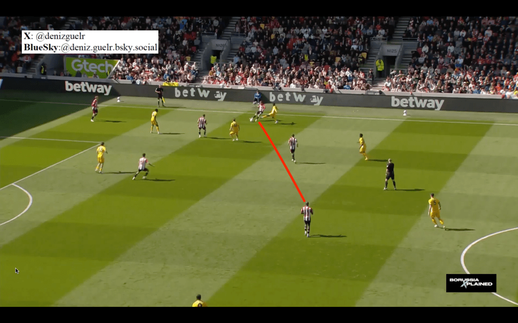 Die Prinzipien des Teams sind klar: Es soll so früh und so schnell wie möglich vertikal gespielt werden. Das bedeutet, dass bei einer Lücke in der vordersten Abwehrreihe die Offensivspieler sofort in die Tiefe laufen, um den langen, direkten Ball hinter die Abwehr zu spielen. Wird stattdessen Raum vor der Abwehr frei, nutzt Brentford diesen gezielt, um den Ball mit dem ersten oder zweiten Kontakt sofort tief hinter die Kette zu spielen. Diese Herangehensweise ist äußerst erfolgreich: Nur sechs Mannschaften in der Premier League haben mehr Tore im Segment “direct attacks” erzielt als Brentford, nämlich insgesamt sechs.