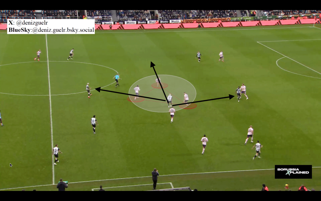 Gegnerisches frontales Pressing schneidet lediglich die vertikale Bahn ab. Die beiden Diagonalen (nach oben links und rechts) bieten im progressiven Passspiel freie Winkel, die Brentford gezielt nutzt.