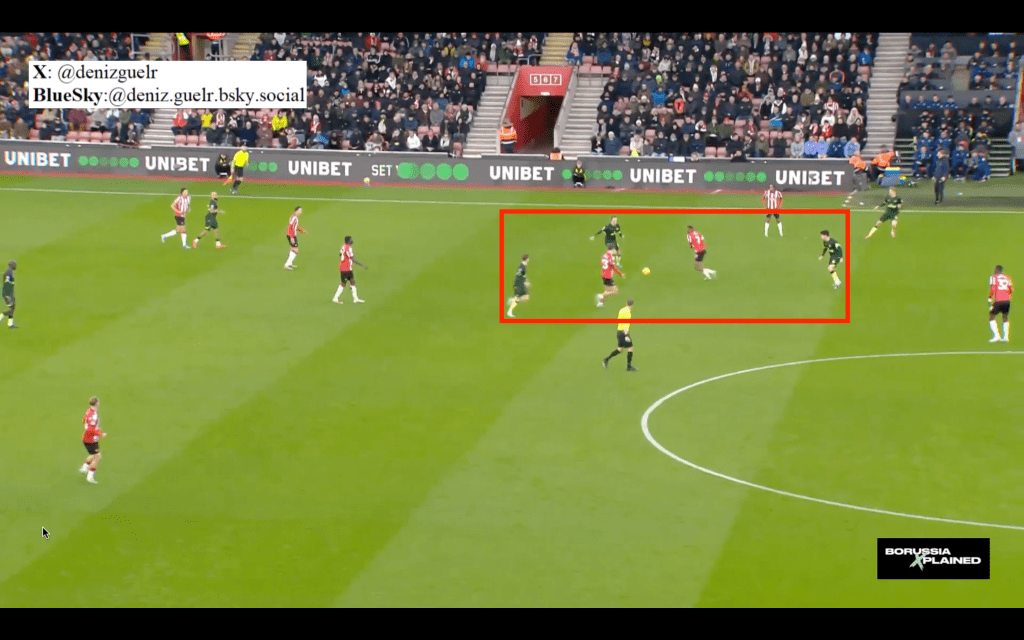 • Schnelles Spiel auf die Flügel: Die flache Staffelung der Dreierkette eröffnet diagonale Passfenster von der ersten in die dritte Linie. Besonders auf der rechten Angriffsseite nutzt Mbeumo seine Flügelstärke, um in Innenkanäle zu dribbeln und sich neue Passwinkel zu verschaffen. Diese Flügelaktionen sind essenziell, um die gegnerische Defensive zu öffnen und die Angriffe zu variieren.