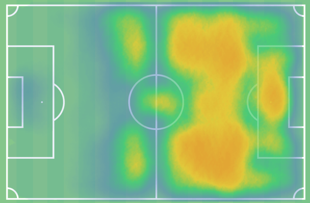 Durch Machinos Aktivität existieren keine klaren Muster bezüglich seiner Angriffszonen – diese sind kontextabhängig. Es gibt Szenen, in denen er über die rechte Seite in die Box eindringt und am zweiten Pfosten trifft, sowie Momente, in denen er zentral einläuft und sich seinen Raum im Rückraum, oder von „außen“ – hinter den Innenverteidigern – sucht.