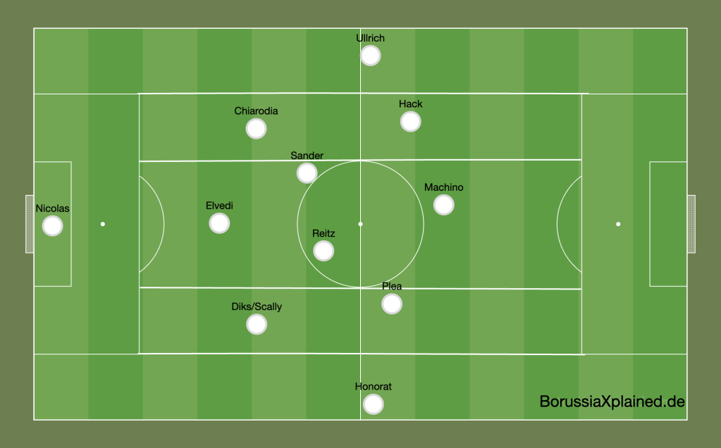 Machino ist ein sehr aktiver und mobiler Spieler. Sein Entgegenkommen, das eine kurze Anbindung zu den Mittelfeldspielern schafft, ermöglicht hinter ihm Tiefe für andere Spieler. Dies bedeutet, dass er neben einem zweiten Stürmer spielen muss, der seine Mobilität auffängt und einen Fixpunkt im Zentrum darstellt. Fehlt Borussia diese Präsenz, wird die letzte Linie unterladen und dadurch weniger Gefahr ausgestrahlt. Zumindest benötigt Gladbach Tiefe um ihn herum, die seine frei geschaffenen Räume attackiert. Robin Hack könnte in dieser Hinsicht eine Rolle spielen.
