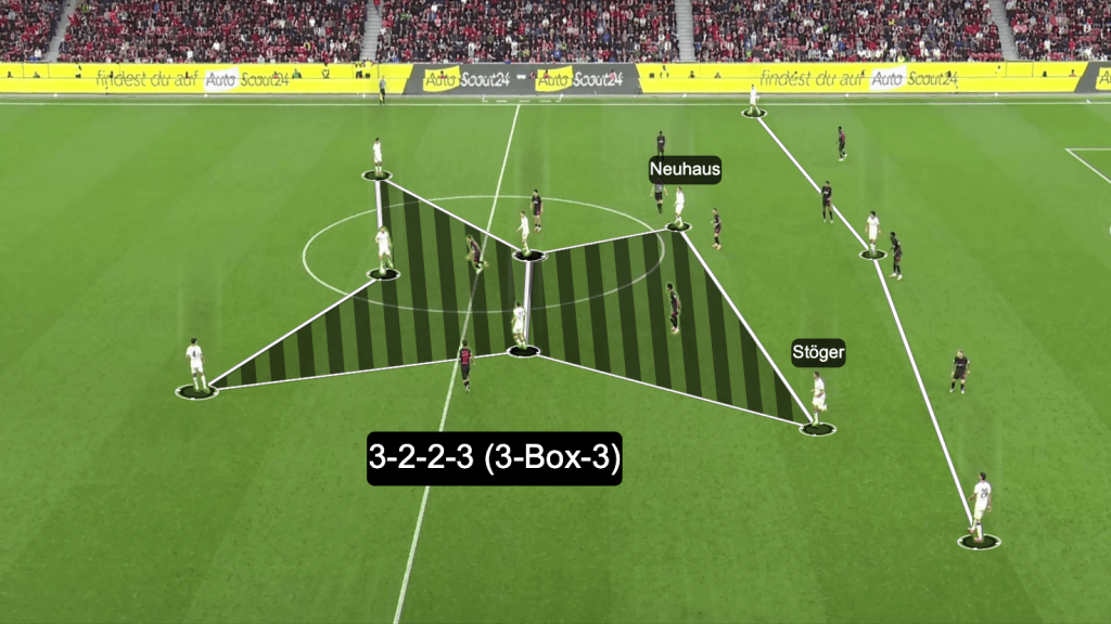 Eugen Polanski wechselte nach dem Rückstand in Leverkusen mit Florian Neuhaus unmittelbar einen weiteren Zehner ein. Die Grundordnung im Ballbesitz: 3-2-2-3 (3-Box-3).