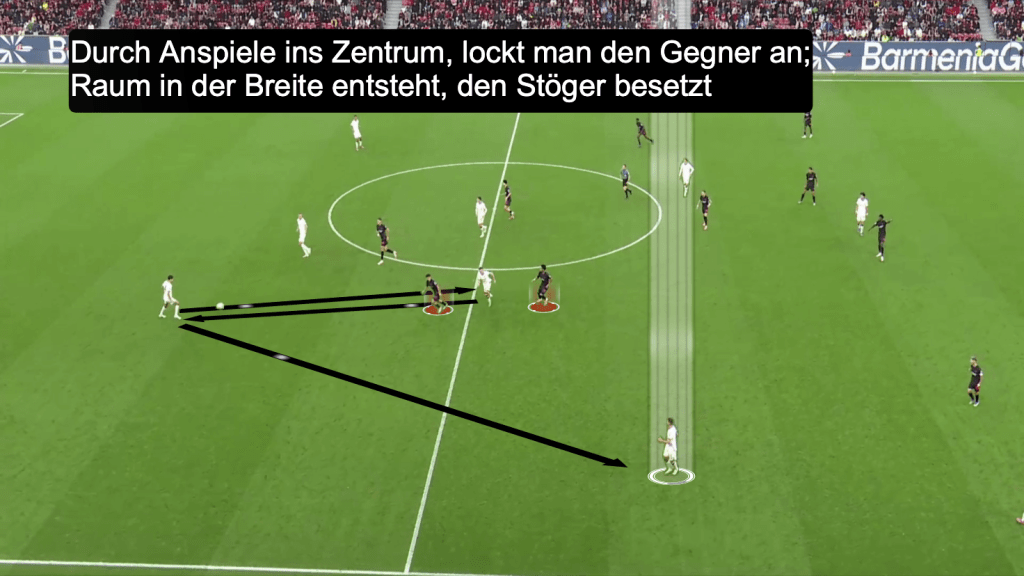 Borussia interpretierte dies im Ballbesitz in die Breite abkippend, denn: Leverkusen verdichtete nach ihrer Führung im 5-4-1 das Zentrum, und verteidigte kompakt im Raum. So zog man, durch das Abkippen von Stöger, das Spiel in die Breite, um den Gegner anzulocken und in Folge dessen Räume im Zentrum zu öffen.