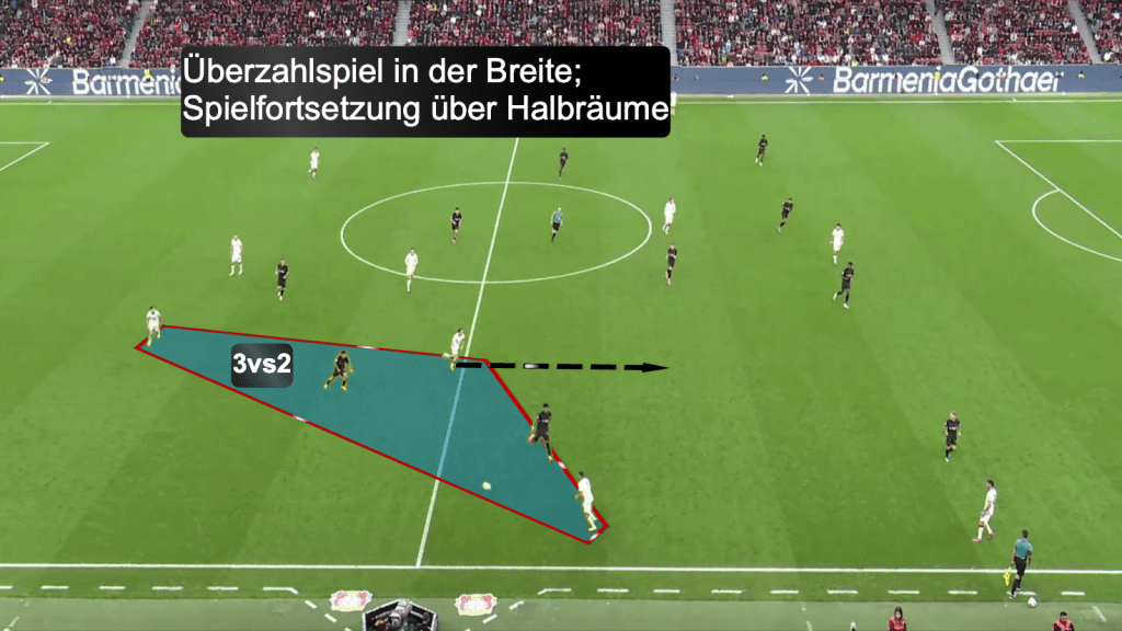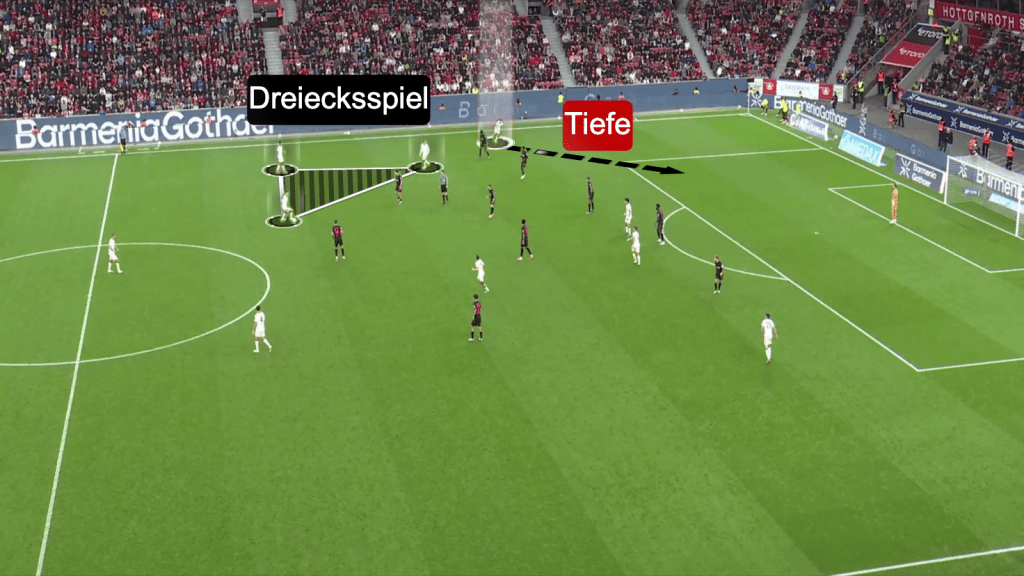 Auf der anderen Seite im letzten Drittel angelangt waren klassische Positionsspiel-Prinzipien zu erkennen: Dreiecksspiel in Ballnähe; Gleichzeitige Tiefe in der letzten Linie. Dazu spielten die Wingbacks, Ullrich und Scally, die Hauptrolle.