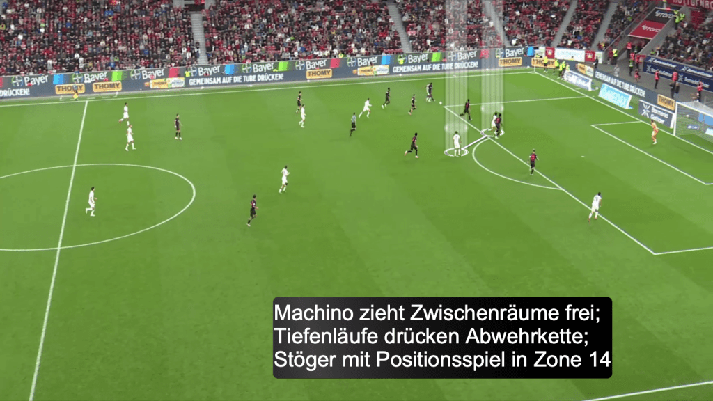 Gerade Florian Neuhaus war nach seiner Einwechslung sehr präsent in der Spielentwicklung, sodass die Fohlen zum Beispiel einzelne Durchbrüche am Flügel schufen. In der Beispielszene war zudem das Spiel rund um und in der Box im Timing, sowie im Verhältnisspiel zueinander clever abgestimmt. Machino drückte mit seinem Tiefenlauf die Abwehrkette des Gegners, sodass Stöger im gewonnen Zwischenraum seine Positionierung zentral vor dem gegnerischen Tor fand. Neuhaus´und Ullrichs Spiel konnten Stöger finden – seine Chance hatte immerhin einen xG-Wert von 0.15.
