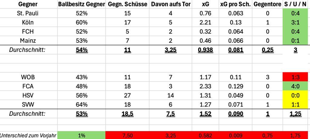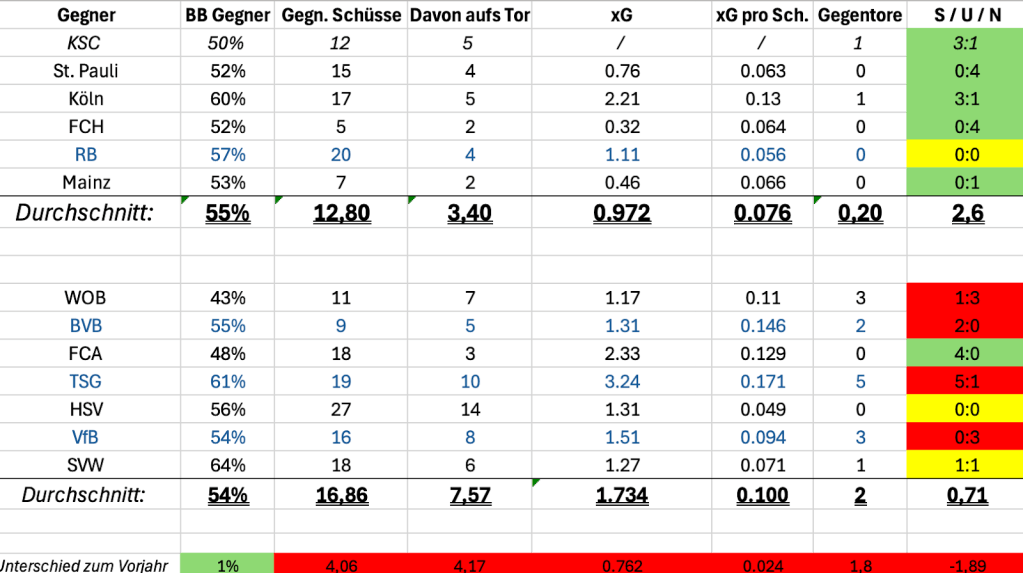 Bremen als Pech oder Ausrutscher zu bezeichnen wäre zu kurz gegriffen. Es ist zum Teil auch die statistische Konsequenz eines passiven Defensivspiels, das auf Dauer nicht trägt. Kompaktheit allein reicht nicht. Wer stabil sein will, muss Situationen rechtzeitig unterbinden, ehe der Gegner zum Abschluss ansetzt.