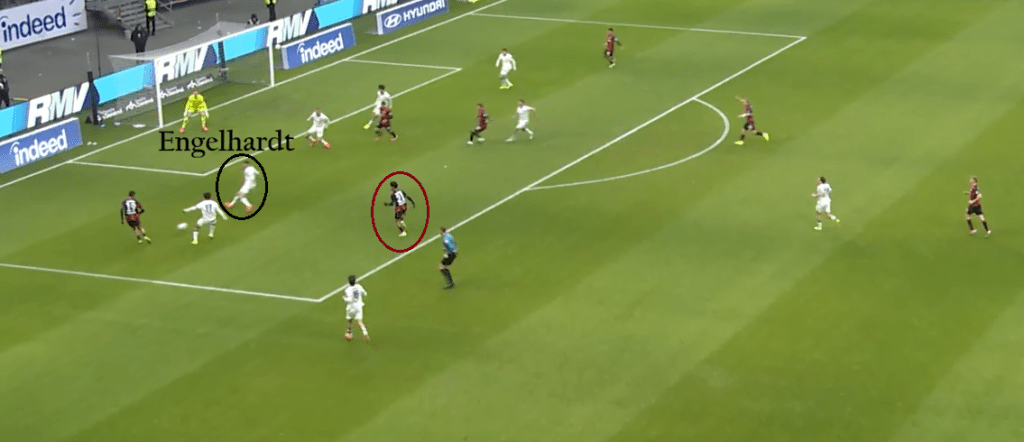 Eine These: Zur Verteidigung der Frankfurter Flügelangriffe wäre eine ballorientierte Verschiebung der Restkette eine Möglichkeit gewesen. Elvedi, Takai und Ullrich blieben starr in ihren festen Positionen – weit entfernt vom Geschehen auf Gladbachs linker Seite. Die Folge: Auf genau dieser Seite entstanden große Räume, die Engelhardt stopfen musste.