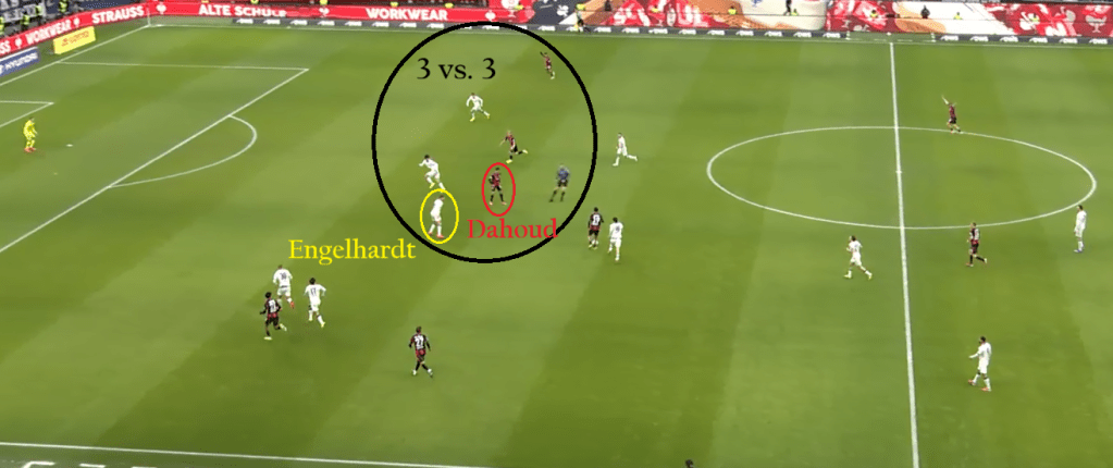 In beiden Fällen war die Ursache dieselbe: Frankfurt überlud den linken Flügel mit Brown, Bahoya und Koch, zog die Abwehrkette auf beiden Seiten in die Breite, und schaffte dadurch in den Schnittstellen Freiheiten, die Engelhardt nicht alleine stopfen konnte, ohne an Präsenz im Sechser-Raum zu verlieren.