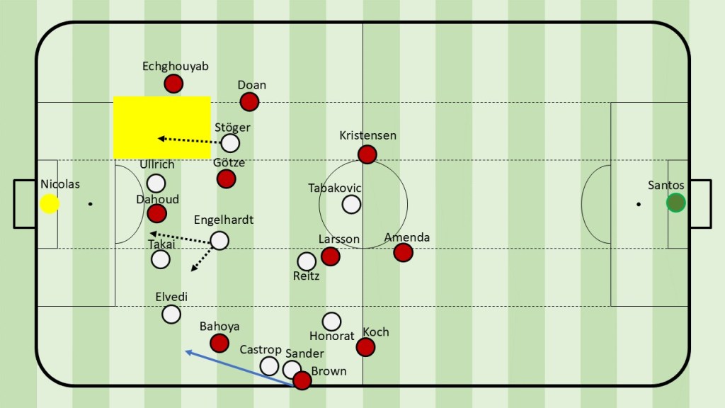 - Castrop im Halbraum durch Browns Position binden und Sander in isolierte 1-gegen-1-Situationen gegen Bahoya verwickeln.