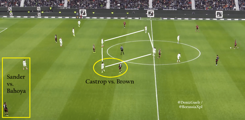 Beide Tore entstehen auf Gladbachs rechtem Flügel und haben in der Enstehung einige, ähnliche Muster. Frankfurt spielte früh auf den linken Flügel, wo Sander und Castrop als Duo erst rausgezogen und anschließend überspielt wurden. Der entscheidende Fehler lag in der Abstimmung beider Spieler: Als Frankfurt auf dem linken Flügel durchbrach, agierten Castrop und Sander nicht als Einheit. Castrop verpasste es, den Tiefenlauf rechtzeitig aufzunehmen.
