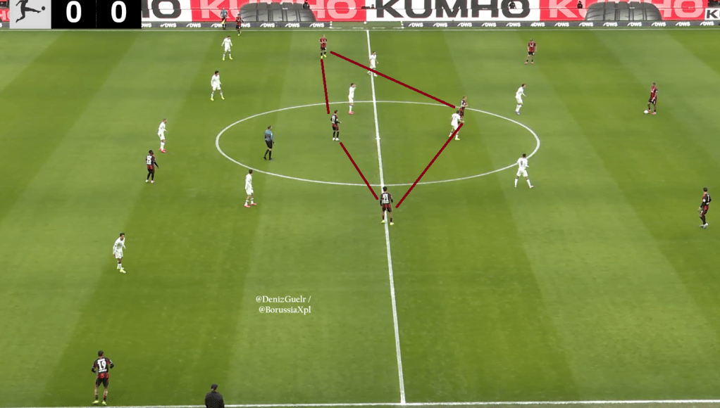 Diese Struktur verfolgte eine klare Absicht: durch die Raute im Mittelfeld numerische Überlegenheit in zentralen Zonen herzustellen und gleichzeitig über die weiträumigen Achter Breite anzubieten. Bemerkbar machte sich diese vor allem auf Frankfurts rechter Seite, wo ein dreifach besetzter Korridor gegen Stöger und Ullrich einen strukturellen Überzahl (3-gegen-2) kreierte.